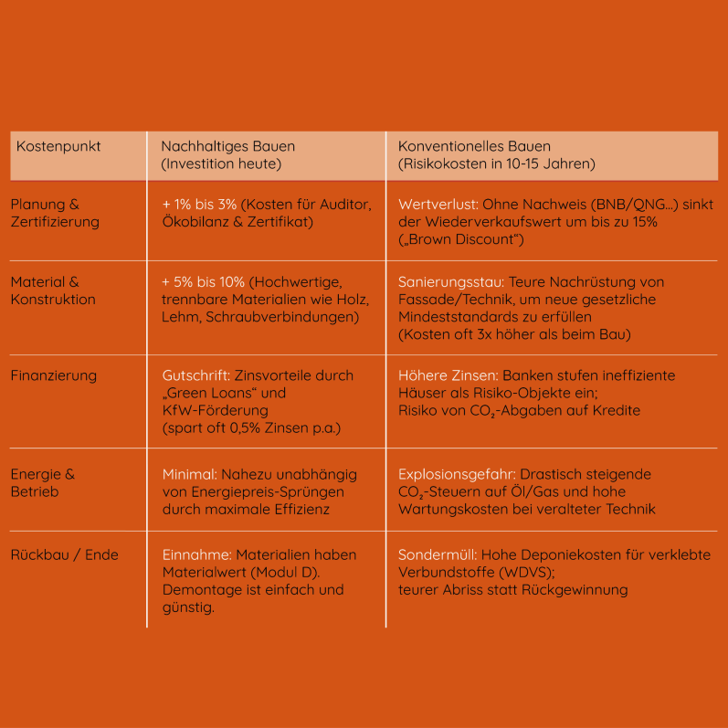 Der entscheidende Unterschied liegt also im Weitblick. Während konventionelle Gebäude oft schon nach wenigen Jahrzehnten zu „Sanierungsfällen“ werden, bleibt ein nachhaltig geplantes Haus flexibel und wertvoll. Durch die Nutzung von Fördermitteln und die massiv sinkenden Betriebskosten gleicht sich der geringe Mehrpreis beim Bau oft schon nach wenigen Jahren aus.