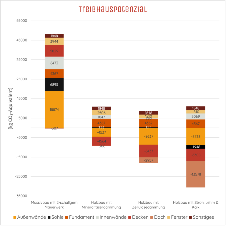 In der Bilanz taucht dieser gespeicherte Kohlenstoff als Minuswert (Gutschrift) auf. Solange das Haus steht, bleibt das CO₂ der Atmosphäre entzogen.