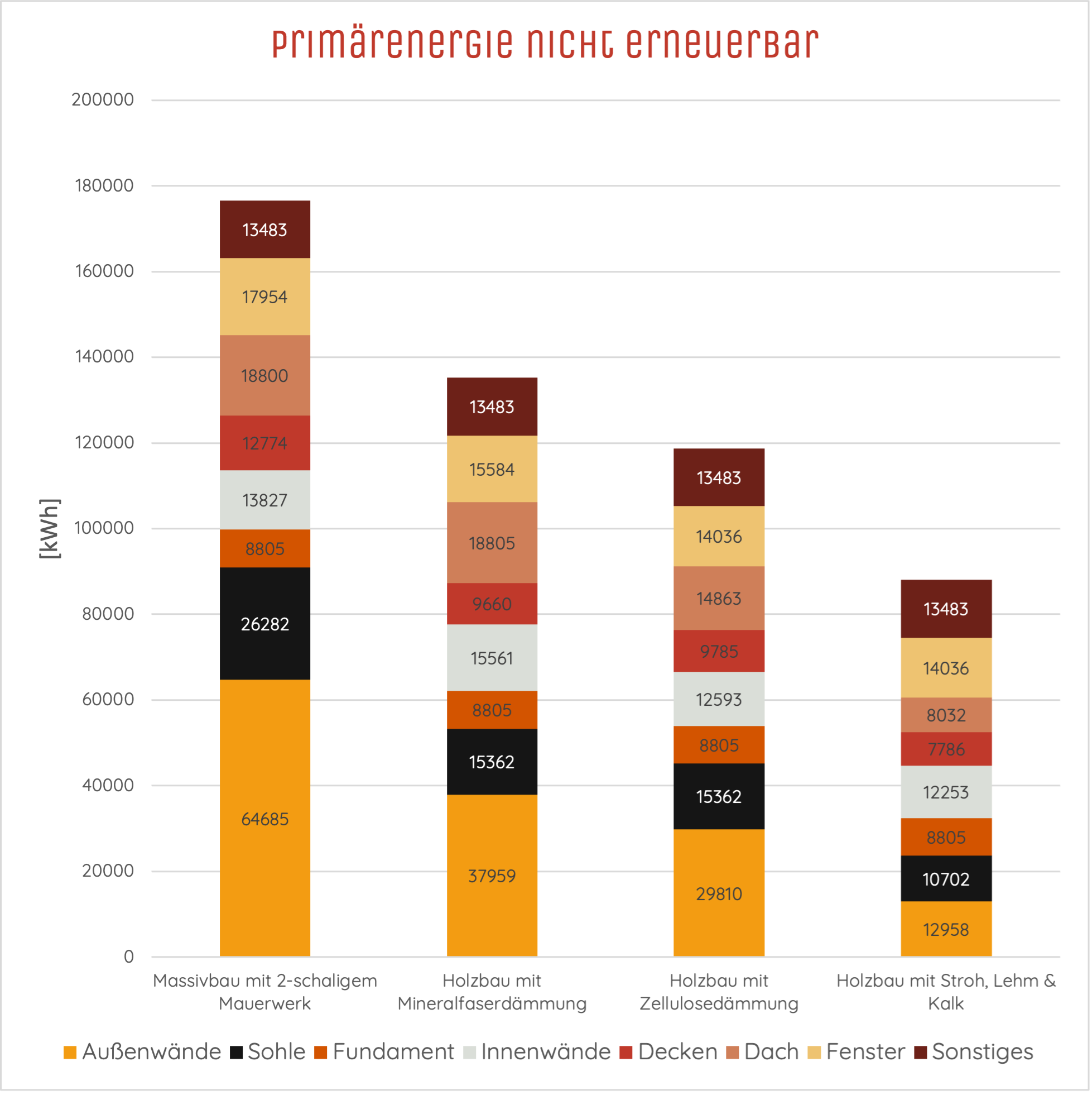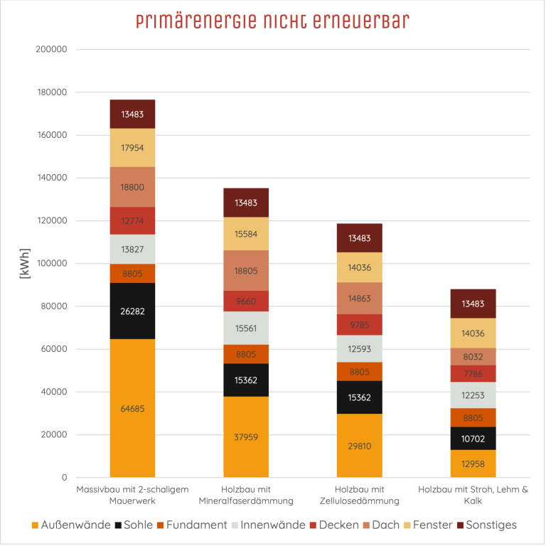 Verglichen werden die herkömmliche Massivbauweise und drei unterschiedliche Holzbauweisen. Dabei wird untersucht, wie viel nicht erneuerbare Energie benötigt wird und wie hoch der Einfluss auf das Klima (CO₂-Ausstoß) ist.