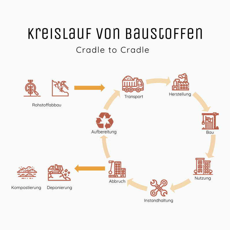 Statt endliche Rohstoffe wie Kies und Erdöl (für Kunststoffe) zu nutzen, soll der Fokus wir nachwachsende Rohstoffe (wie Holz, Stroh oder Hanf)